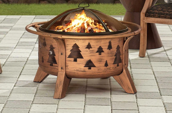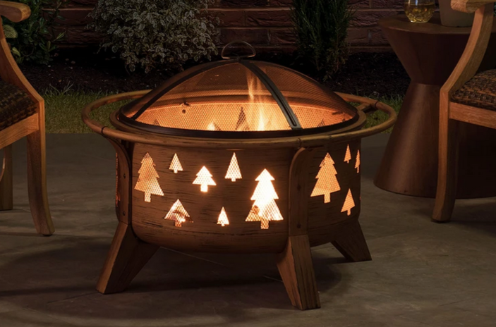 Enjoy your favorite beverage while swapping stories under the stars around this wood-burning firepit , the world’s leading ready-to-assemble outdoor structure maker. Transform your backyard into a relaxation destination. The 30″ rust-resistant powder-coated steel firepit comes with a fire poker and mesh screen cover to limit sparks. The tree design adds visual interest to the piece even when it’s not in use.