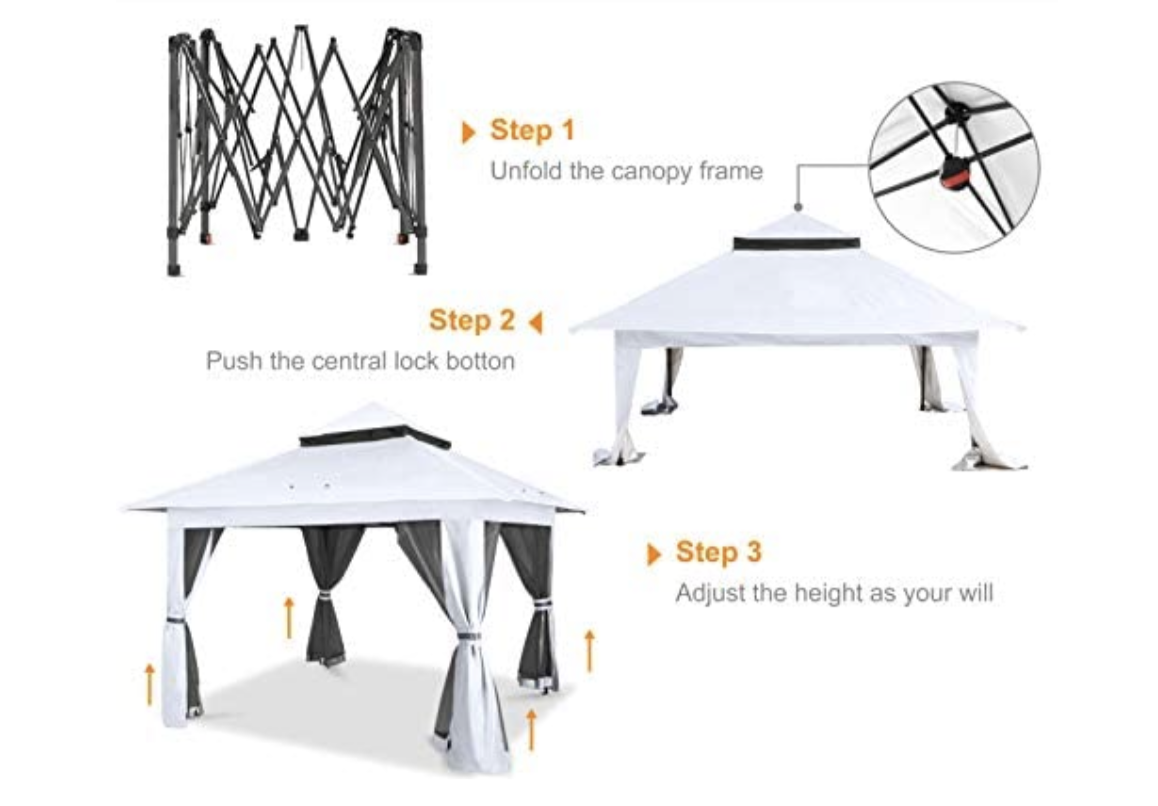 - 【Easy Setup & Portable】 13X13 Pop up Gazebo designed with Patented Central Lock Technology, setup is easy, efficient and hassle-free. This gazebo is lightweight and comes with a convenient carrying bag, so you can easily bring the gazebo to anywhere.