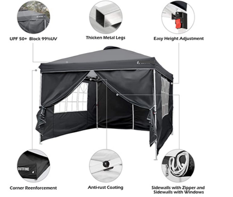 - MULTIPLE USE OCCASIONS – The shadow coverage of this canopy is 10 x 10 feet and it can accommodate 4 tables or 7-8 people at the same time. This canopy is suitable for home garden, play ground, yards, farm beaches, commercial area, large gymnasiums, construction area, disaster relief area and more. 4 side tarpaulins are included, 2 with zippers, and 2 with windows, it can be installed or disassembled according to different occasions, which is convenient and practical.
