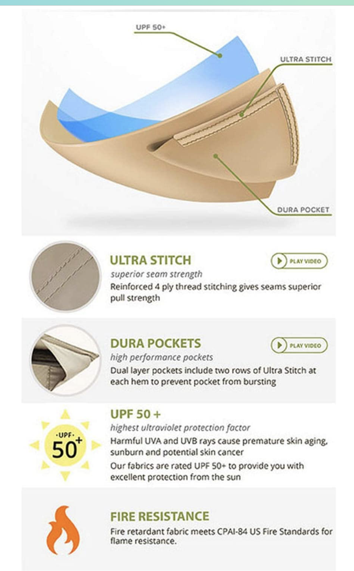 - UPF 50+, water resistant, CPAI-84 fire retardant