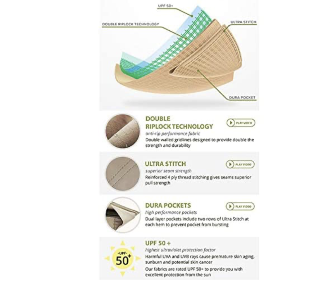 - UPF 50+, water resistant, CPAI-84 fire retardant