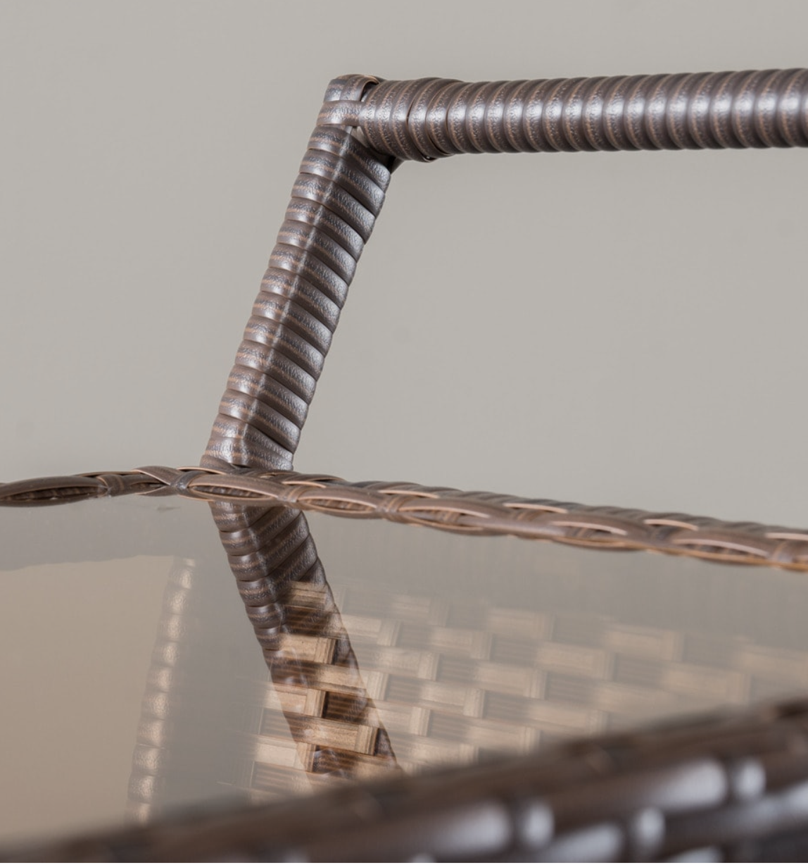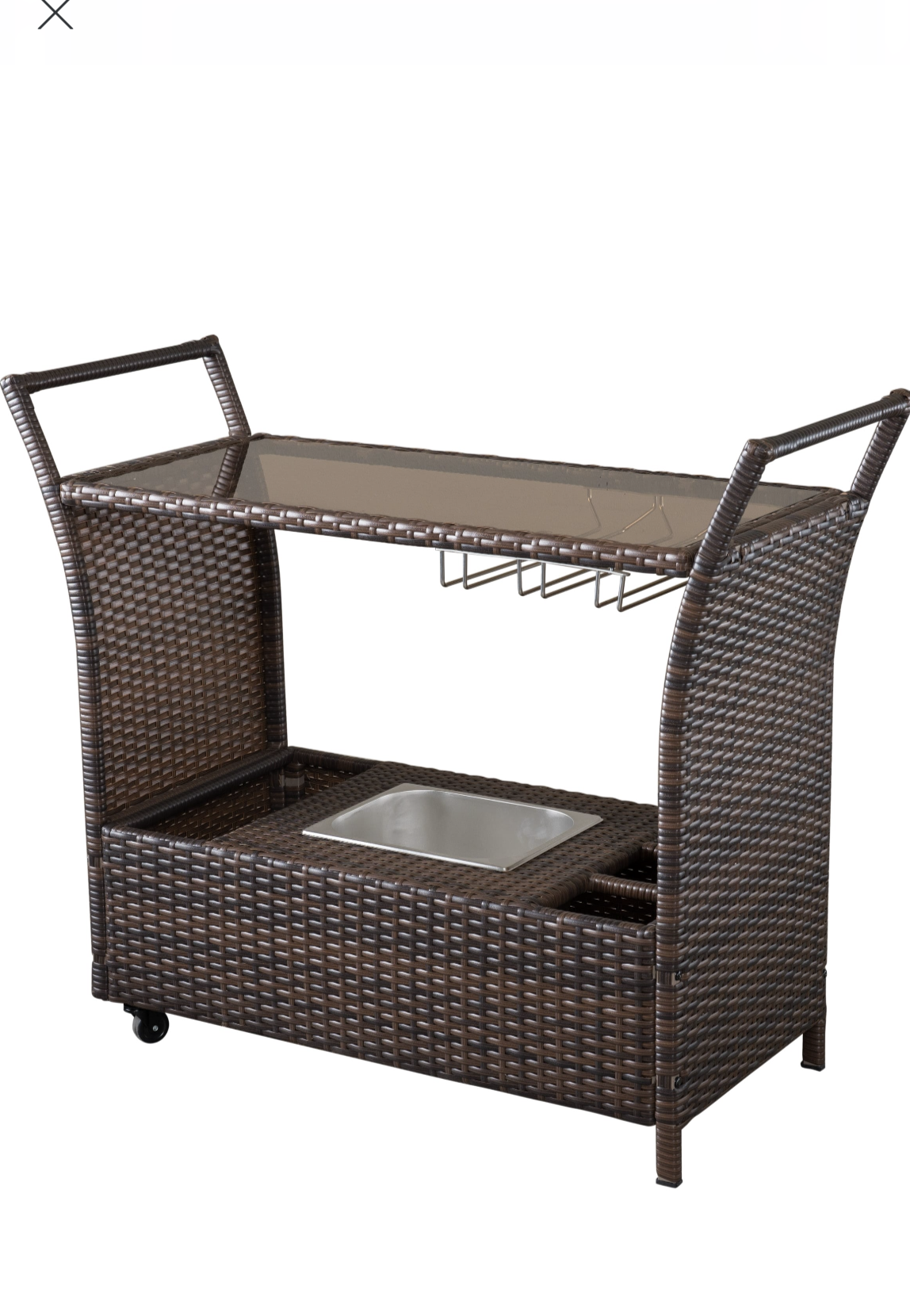 Add a hint of tropical charm to your decor with this Caribbean outdoor bar cart The cart is crafted with a wicker-woven aluminum frame, and features curved sides, a glass top, stemware racks, and a versatile base with a removable ice bucket. Ideal for storing snacks and beverages, this cart is the perfect choice for pool-side food service.
