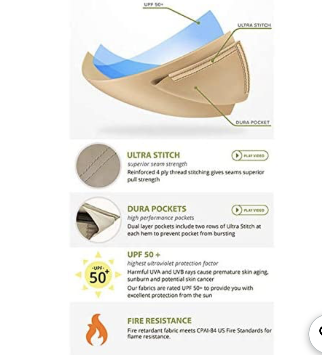 - UPF 50+, water resistant, CPAI-84 fire retardant