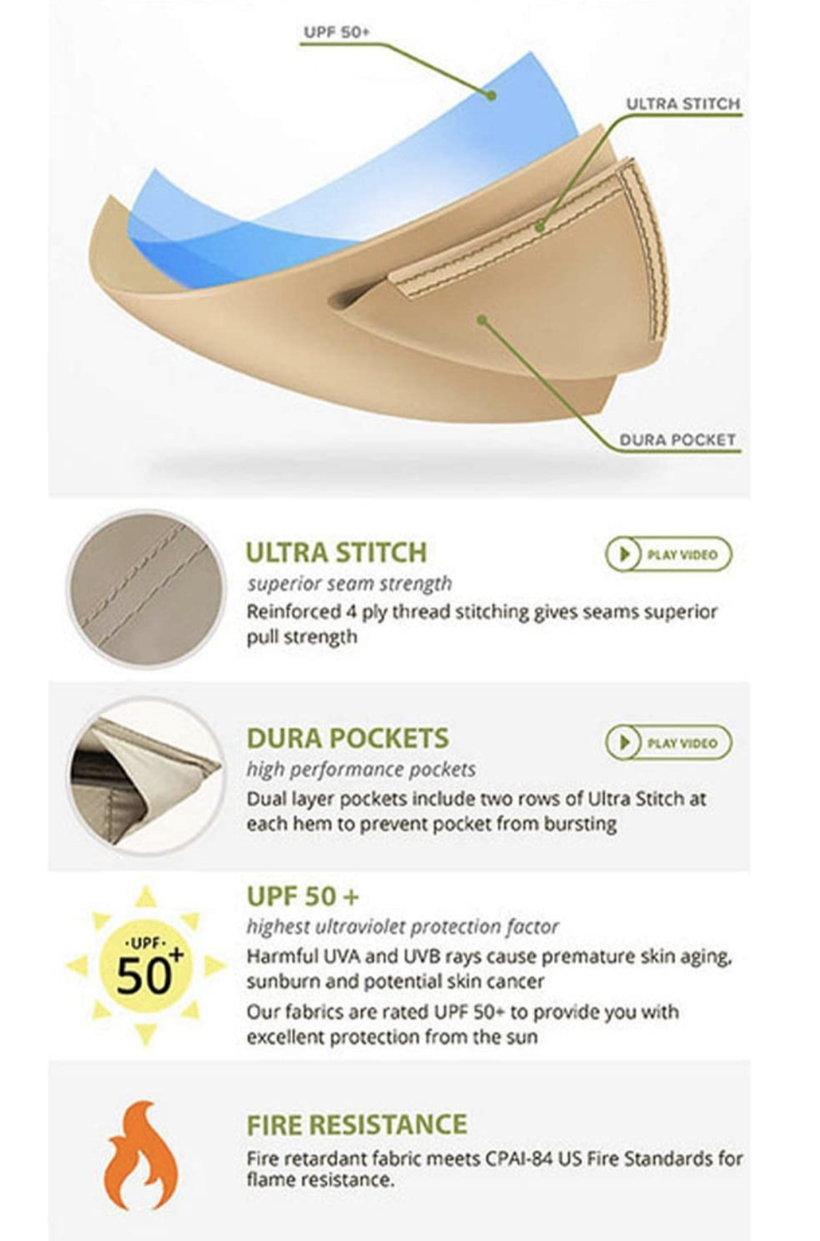 - UPF 50+, water resistant, CPAI-84 fire retardant